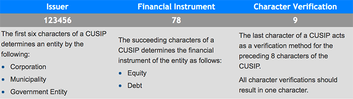 Each CUSIP number consists of nine alphanumeric characters. These alphanumeric characters of a CUSIP classify an entity in 3 different ways as shown below: